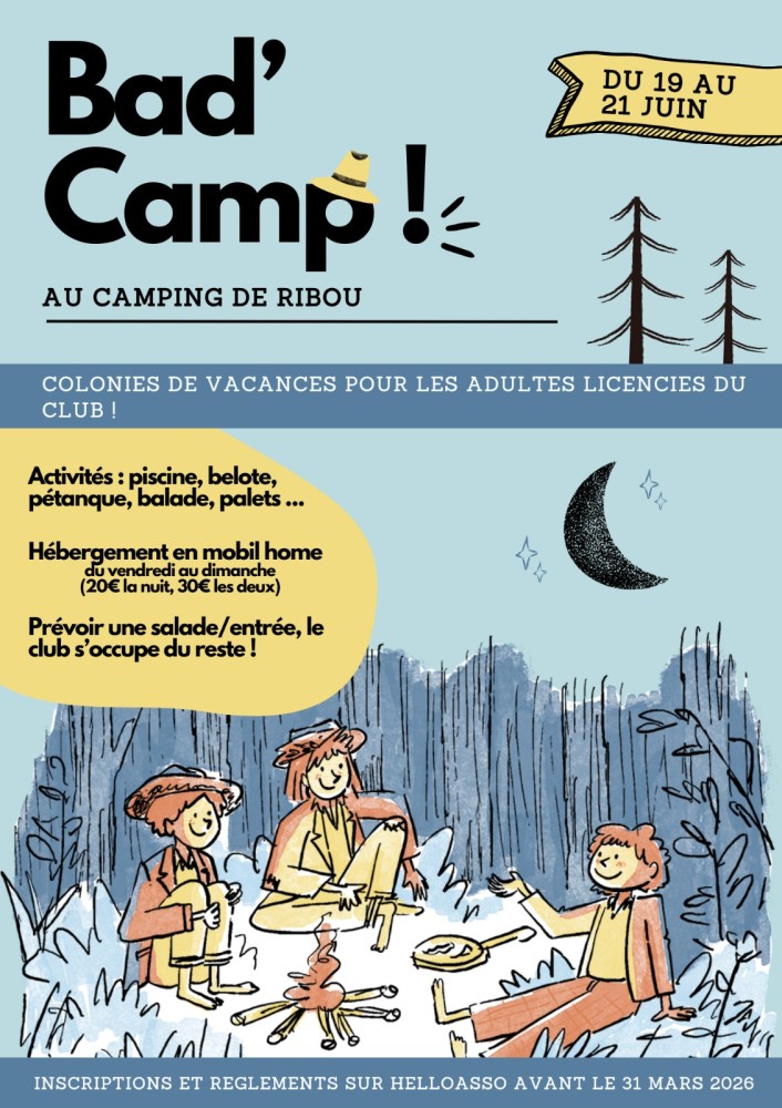 Pour vous y aider, le bureau propose aux adhérents du créneau adultes, et leurs conjoints, un week-end au camping de Ribou à Cholet, du vendredi 19 juin au soir jusqu'au dimanche 21 juin au midi.